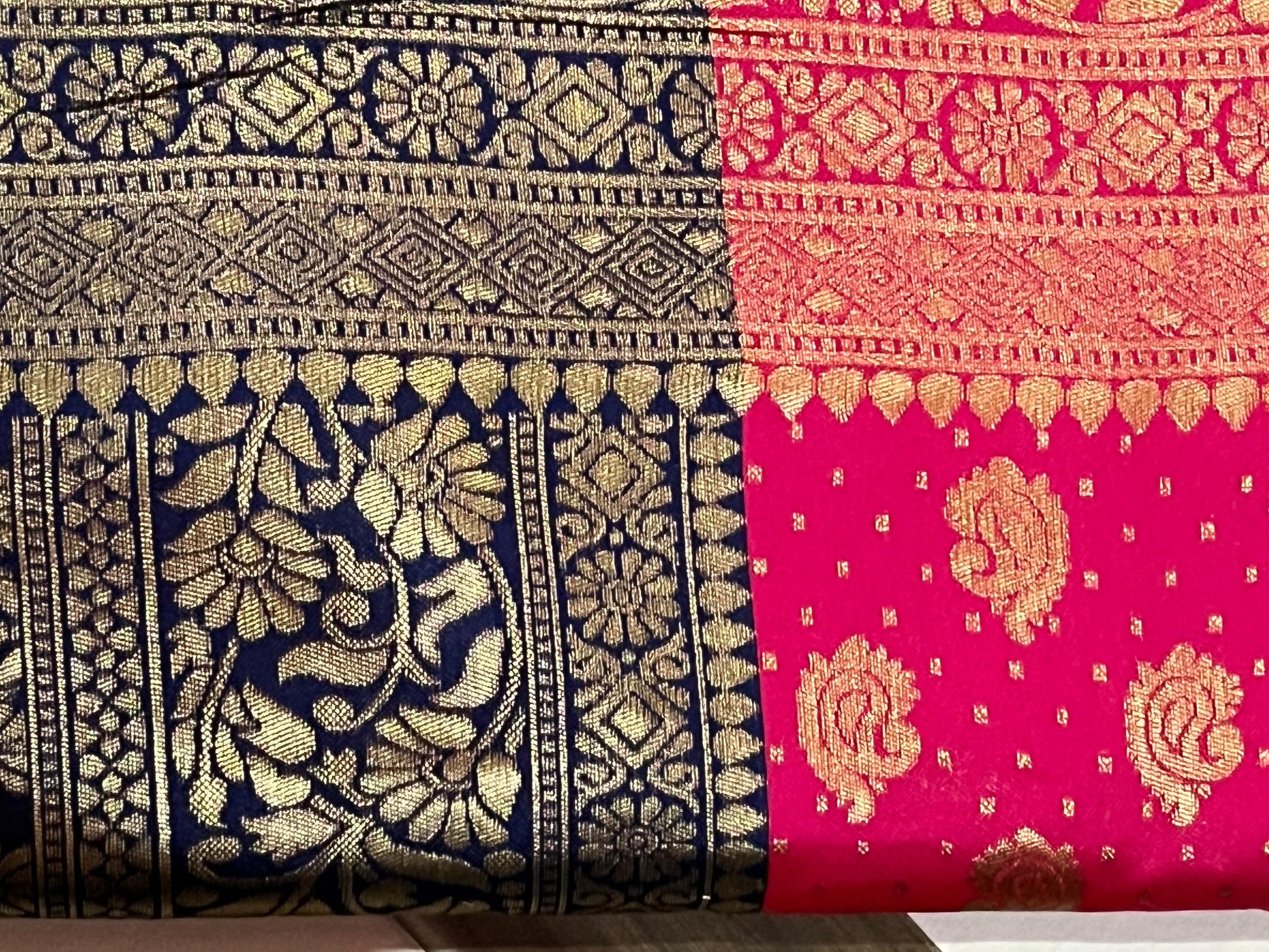 Indulge in regal elegance with this exquisite emerald pink Kanjeevaram silk saree, a timeless embodiment of tradition and luxury. Meticulously woven from pure silk, this saree features an elaborate gold zari weave across the body, showcasing detailed floral and paisley motifs that speak to generations of fine South Indian craftsmanship.