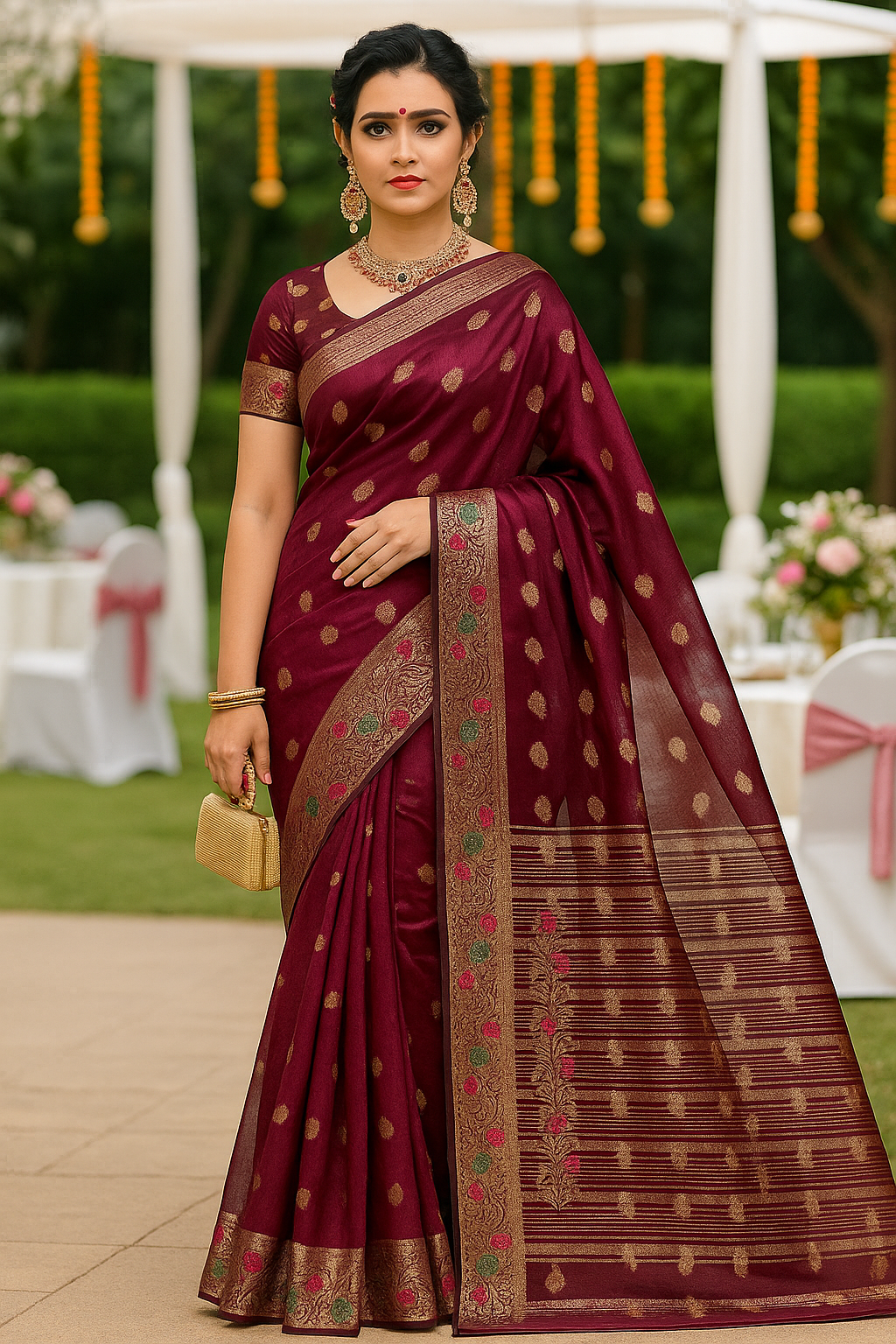 The saree is adorned with golden zari buttas across the body, while the pallu and border are intricately woven with floral and paisley patterns in shimmering gold thread. The classic blend of deep maroon and golden tones brings a vibrant yet regal aesthetic, making it a perfect choice for both traditional events and modern festivities.