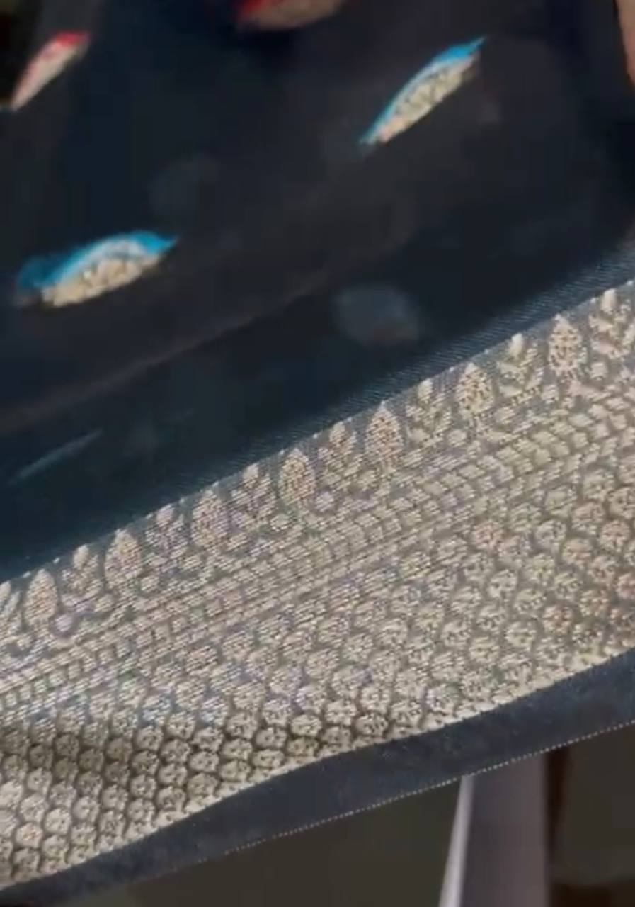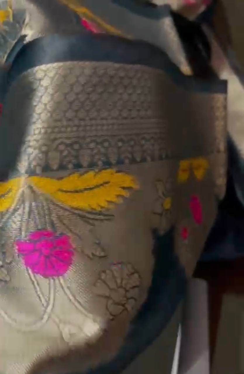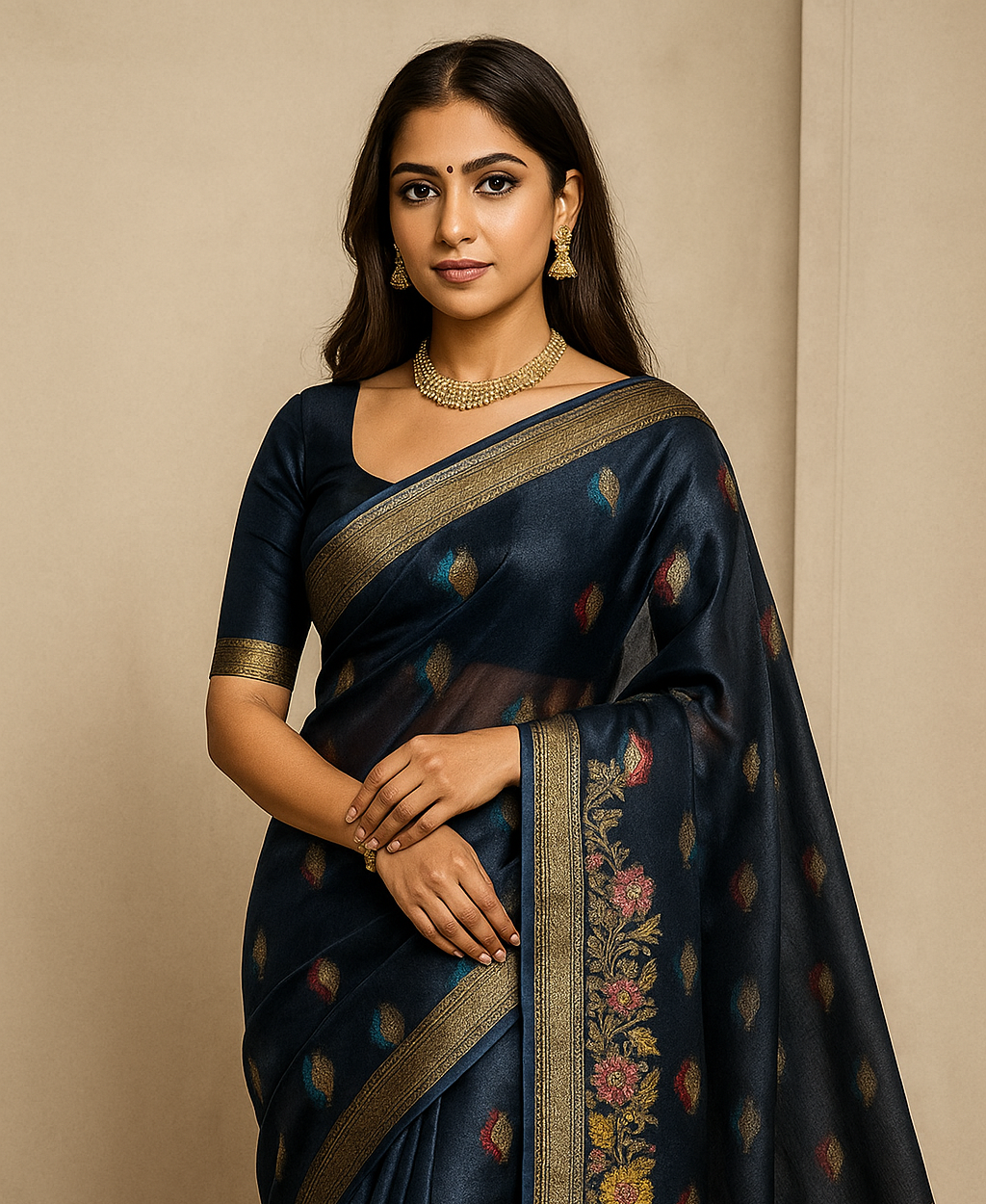 Elevate your ethnic wardrobe with this elegant dark blue Organza Silk Saree, designed to make a subtle yet sophisticated statement. The saree features delicate zari motifs across the body and a contrasting rich pallu with intricate floral embroidery in gold, pink, and yellow – perfect for festive and formal occasions.