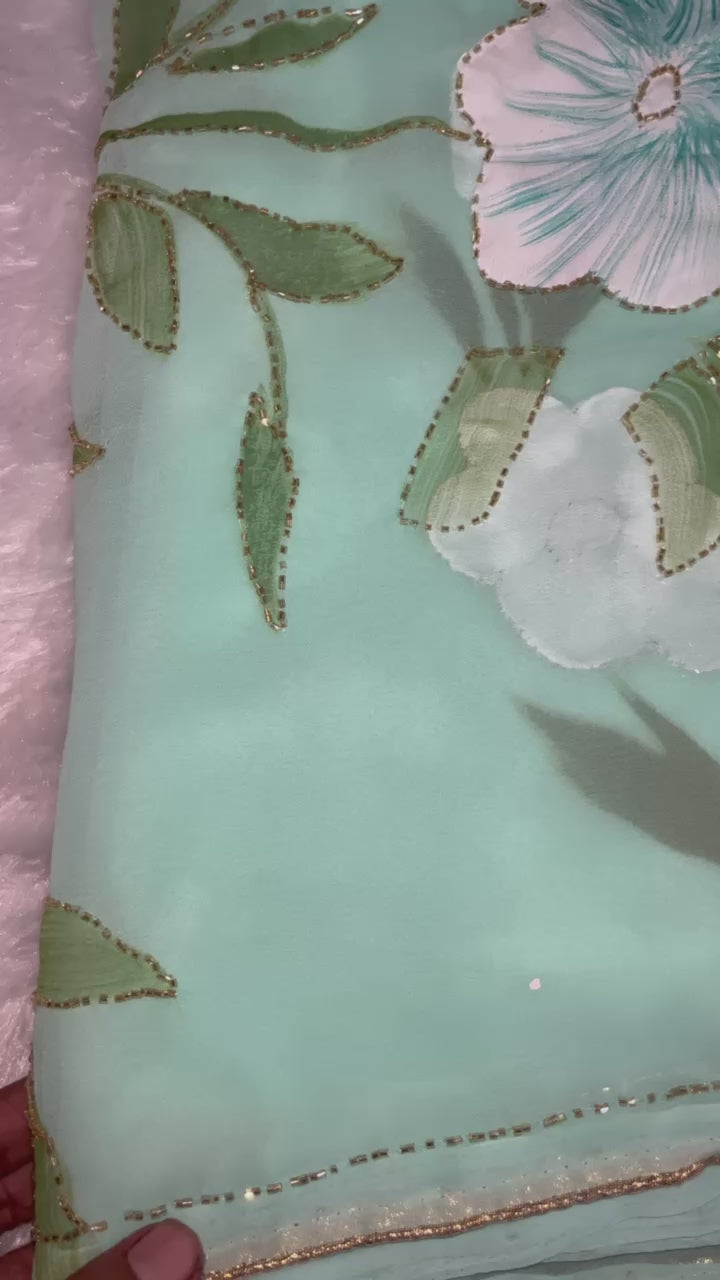Hand-Brush Painted Saree in Pure Royal Georgette with Designer Blouse – Elegant Wedding & Party Wear Saree