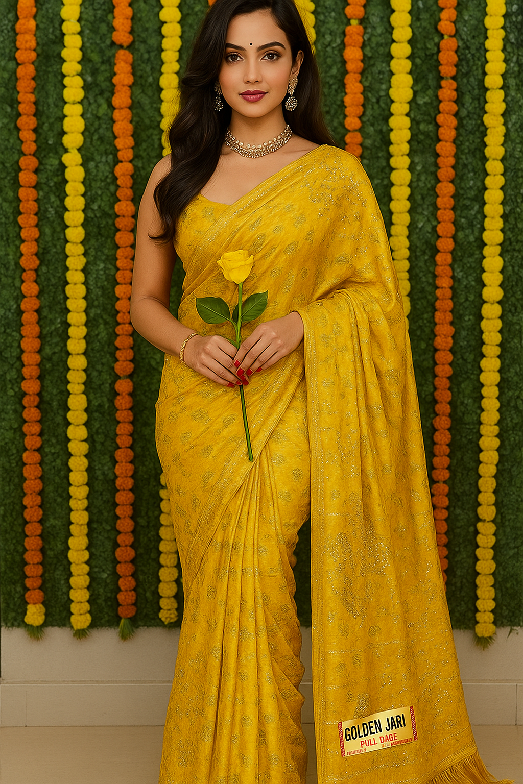 Complete with a matching unstitched blouse piece in the same radiant yellow shade, this saree gives you the freedom to tailor your look — whether you prefer a minimalist aesthetic or a more glamorous statement.