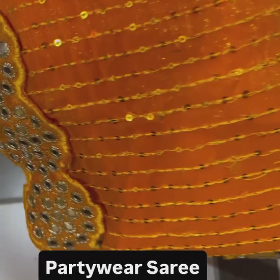 Bask in festive warmth with the Sunlit Bloom Saree — a vibrant yellow georgette drape kissed with sequins and delicate mirror work. Light as air, the fabric flows effortlessly while the floral scalloped border reflects brilliance in every step.